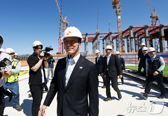김민석 국무총리가 11일 오전 경기 용인시 처인구 반도체 클러스터 공사현장에서 관계자들과 기념촬영을 마치고 나서고 있다. 2025.9.11/뉴스1 © News1 청사사진기자단