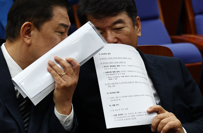 27일 오후 서울 여의도 국회에서 열린 더불어민주당 의원총회에서 문진석 원내운영수석부대표가 자사주 소각 의무화 관련 내용이 적힌 문서를 들고 김병기 원내대표와 대화하고 있다. (사진 = 뉴시스)