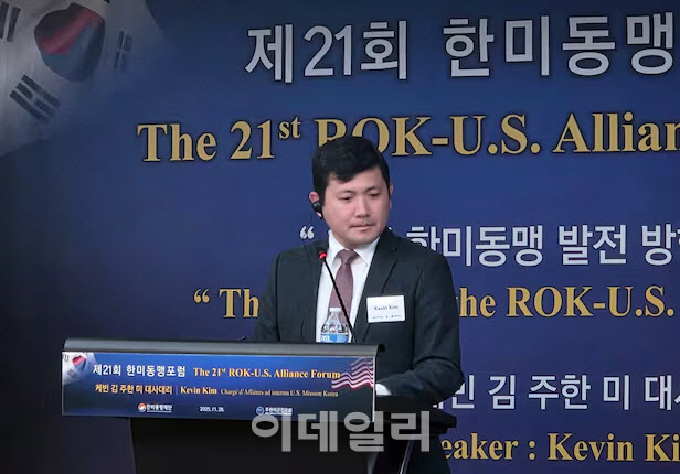 케빈 김 주한 미국 대사대리가 28일 서울 용산구 드래곤힐호텔에서 한미동맹재단 주최로 열린 한미동맹포럼에 초청연사로 단상에 오르고 있다.[연합뉴스 제공]