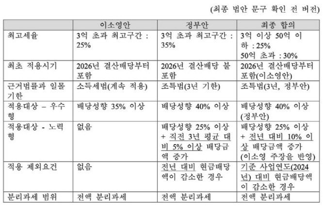 당초 정부안은 배당성향 25% 이상인 기업에 대해서는 ‘3년 평균 대비 5% 이상 증가’한 경우만 분리과세 혜택을 부여키로 했으나, 여야 협의과정에서 조건이 달라졌다.
