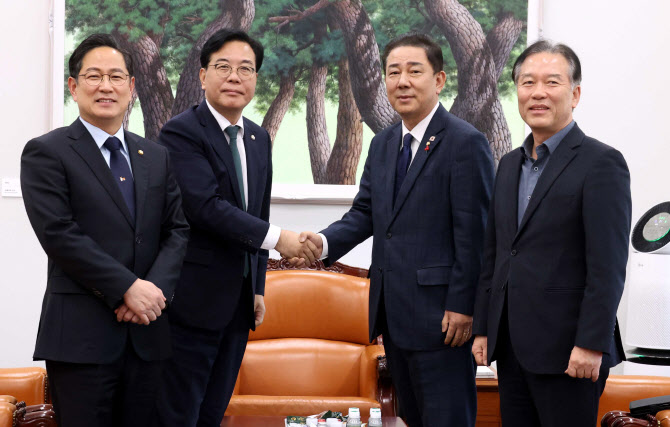 김병기 더불어민주당 원내대표와 송언석 국민의힘 원내대표가 28일 오후 서울 여의도 국회 운영위원장실에서 회동을 하기 전 악수를 하고 있다. 왼쪽부터 박수영 기재위 예산소위 위원장, 송 원내대표, 김 원내대표, 정태호 기재위 경제재정소위 위원장(사진 = 뉴시스)