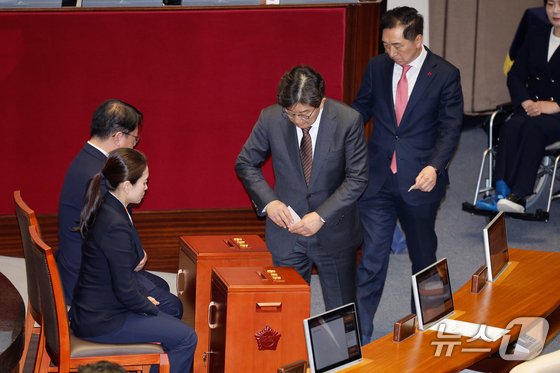 2024년 12월 14일 오후 권성동 국민의힘 원내대표, 김기현 의원이 서울 여의도 국회에서 열린 제419회국회(임시회) 제4차 본회의에서 윤석열 대통령 탄핵소추안 무기명 투표를 하고 있다. 2024.12.14/뉴스1 © News1 안은나 기자
