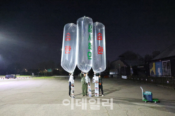 납북자가족모임이 지난 4월 경기 파주 문산읍 임진각 평화랜드 펜스 뒤편에서 대북전단 8개를 북측을 향해 날려 보낼 준비를 하고 있다. [납북자가족모임 제공]