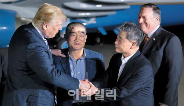 2018년 5월 북한에서 풀려난 김학송(왼쪽에서 셋째) 선교사가 미국 워싱턴DC 인근 공군 기지로 마중 나온 트럼프 미 대통령과 악수하고 있다. 김 선교사 왼쪽은 함께 풀려난 김동철 목사이고, 오른쪽은 폼페이오 미 국무장관.[연합뉴스 제공]