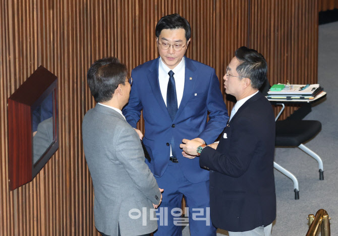 [이데일리 노진환 기자] 제429회국회(정기회) 제13차 본회의가 27일 서울 여의도 국회 본회의장에서 열렸다. 장경태(가운데) 더불어민주당 의원이 본회의장에서 박성준(오른쪽) 의원 등과 대화하고 있다.