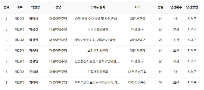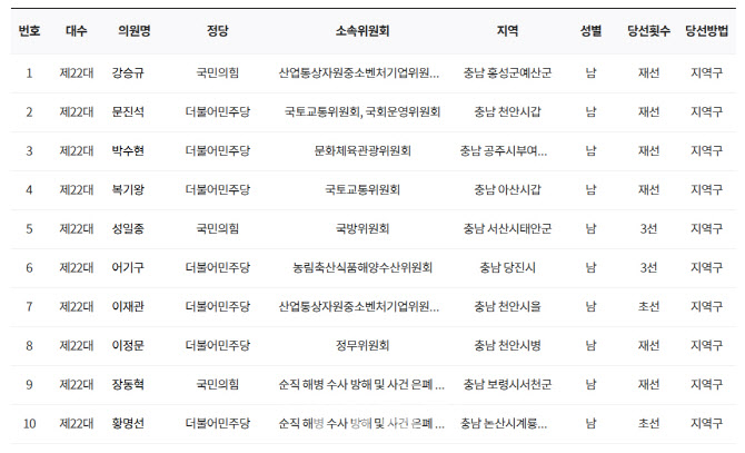 충남 국회의원 현황. 강훈식 대통령비서실장의 사퇴로 아산을은 빠져있다. (자료=국회)