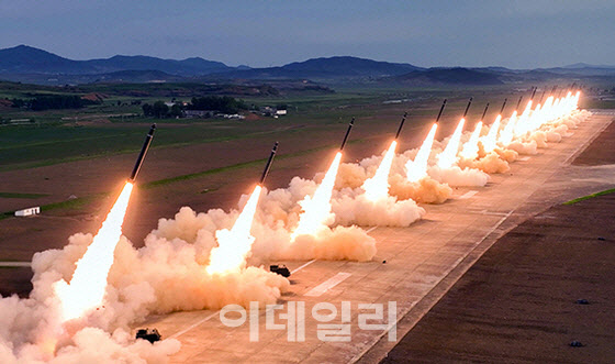 북한군이 지난해 5월 30일 초대형 방사포를 동원한 ‘위력시위사격’을 진행하고 있다[조선중앙통신=연합뉴스 제공]