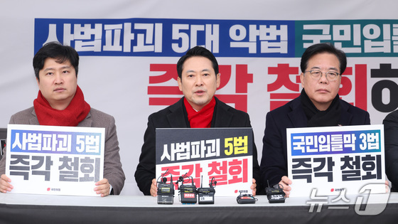 국민의힘은 내란전담재판부 설치와 법 왜곡죄 신설·공수처 수사 범위 확대·대법과 증원·4심제 도입 등을 ‘사법 파괴 5대 악법’으로, 정당현수막 규제·유튜브 징벌적 손해배상제·필리버스터 요건 강화 등을 ‘국민입틀막 3대 악법’으로 규정했다.