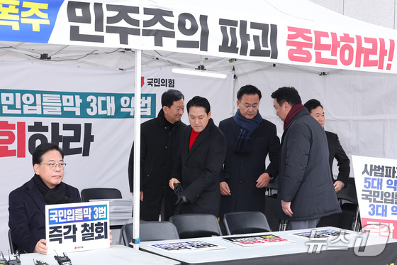 장동혁 대표를 비롯한 국민의힘 지도부가 10일 서울 여의도 국회 본관 앞에 마련된 농성장에서 8대 악법 저지 릴레이 천막 농성을 하고 있다. 2025.12.10/뉴스1 © News1 신웅수 기자