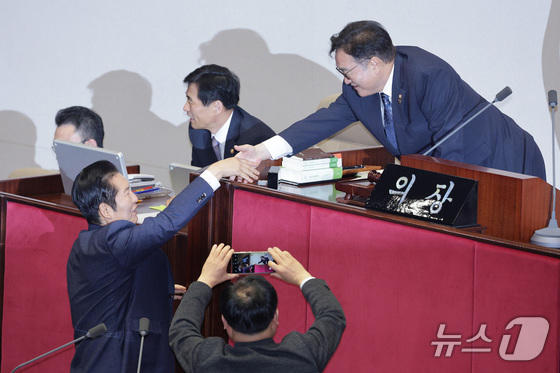 정청래 더불어민주당 대표가 24일 서울 여의도 국회에서 열린 제430회국회(임시회) 제2차 본회의에서 우원식 국회의장과 인사하고 있다. 2025.12.24/뉴스1 © News1 신웅수 기자