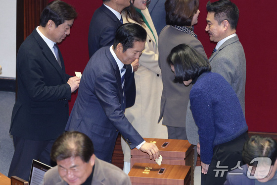정청래 더불어민주당 대표가 24일 서울 여의도 국회에서 열린 제430회국회(임시회) 제2차 본회의에서 정보통신망 이용촉진 및 정보보호 등에 관한 법률 일부개정법률안(대안)에 대한 무제한 토론(필리버스터) 종결동의의 건을 투표하고 있다. 2025.12.24/뉴스1 © News1 신웅수 기자