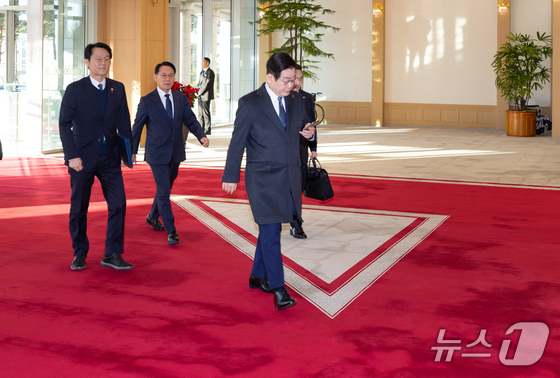 대통령실은 수행원들과 함께 이날 오전 용산 대통령실로 들어서는 이 대통령의 사진을 언론에 공개했다.