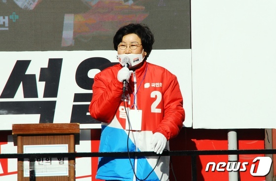 충북 제천 출신인 이혜훈 전 국민의힘 의원이 2022년 3월 6일 증평 장날 지원유세에서 윤석열 후보 지지를 호소하고 있다. 2022.03.06/뉴스1 © News1 김정수 기자