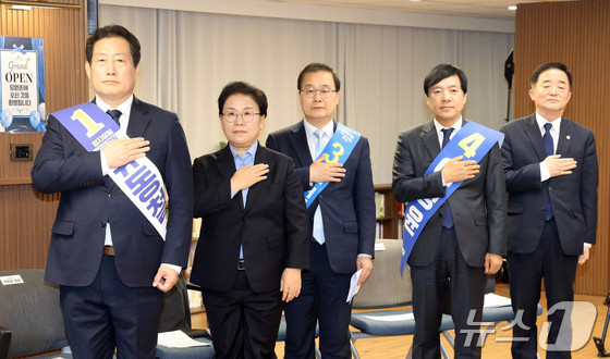 지난 23일 서울 여의도 더불어민주당 중앙당사에서 열린 최고위원 선출을 위한 1차 합동연설회에서 유동철(왼쭉부터), 문정복, 이건태, 이성윤, 강득구 최고위원 후보들이 국민의례하고 있다. 2025.12.23/뉴스1 © News1 국회사진기자단