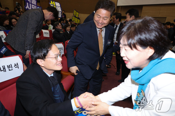 서영교 더불어민주당 의원이 지난해 12월 18일 서울 여의도 국회 의원회관에서 열린 서울서울서울 특위 발대식에서 박주민, 김영배 의원과 인사하고 있다. 2025.12.18/뉴스1 © News1 신웅수 기자