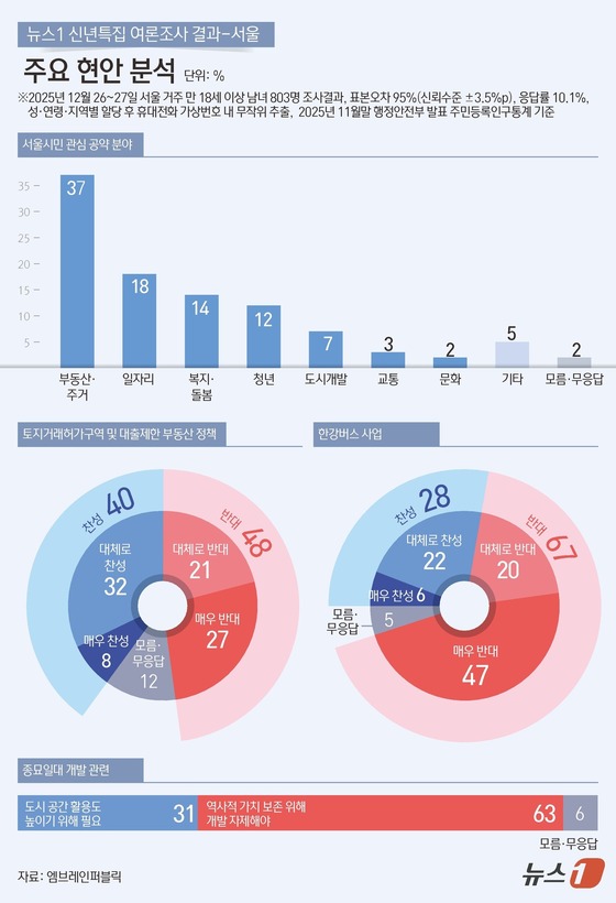 한강버스, 종묘 개발 등 세부 사업에 대해서도 부정 평가가 긍정 평가를 앞질렀다. 논란이 됐던 사업들도 오세훈 시정에 대한 부정 평가에 적잖은 영향을 미친 것으로 보인다.