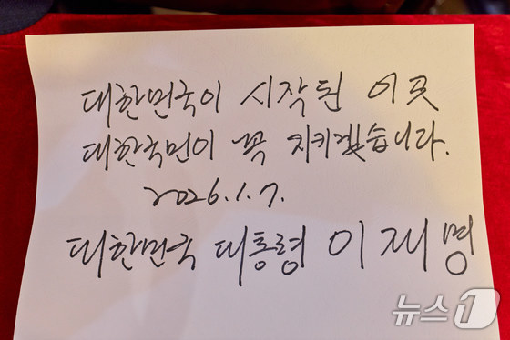 이재명 대통령이 7일 오후 상하이 임시정부청사 기념관을 찾아 작성한 방명록. (공동취재) 2026.1.7/뉴스1 © News1 허경 기자