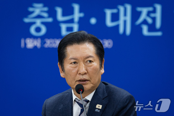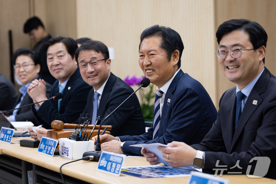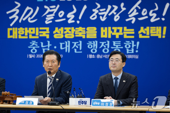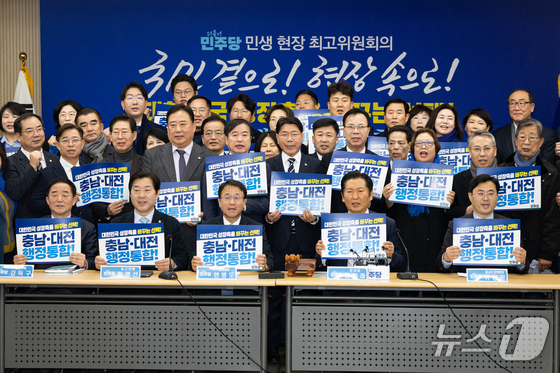 정청래 더불어민주당 대표와 한병도 원내대표를 비롯한 지도부와 참석자들이 14일 충남 서산시 서산축산종합센터에서 열린 충남 민생 현장 최고위원회의에 앞서 '충남·대전 행정통합' 피켓팅 퍼포먼스를 하고 있다. 2026.1.14/뉴스1 © News1 유승관 기자