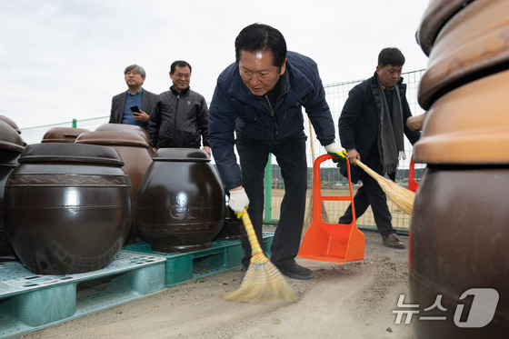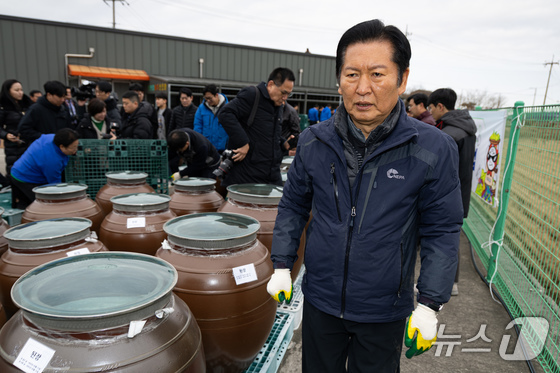 정청래 더불어민주당 대표가 14일 충남 당진시 백석올미마을기업을 방문해 장독 옮기기 작업을 하고 있다. 2026.1.14/뉴스1 © News1 유승관 기자