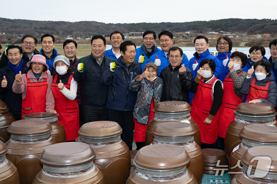 정청래 더불어민주당 대표와 지도부가 14일 충남 당진시 백석올미마을기업을 방문해 마을기업 관계자들과 기념 촬영을 하고 있다. 2026.1.14/뉴스1 © News1 유승관 기자