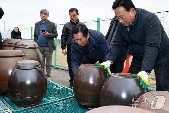 정청래 더불어민주당 대표가 14일 충남 당진시 백석올미마을기업을 방문해 장독 옮기기 작업을 하고 있다. 오른쪽은 어기구 농해수위원장. 2026.1.14/뉴스1 © News1 유승관 기자