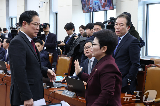 임이자 위원장이 19일 서울 여의도 국회에서 열린 재정경제기획위원회가 정회된 후 정태호 더불어민주당 간사와 박수영 국민의힘 간사를 지나치고 있다. 2026.1.19/뉴스1 © News1 신웅수 기자
