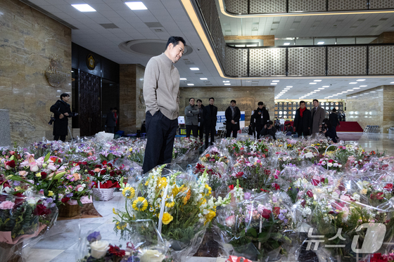더불어민주당의 통일교 및 공천뇌물 특검 수용을 촉구하며 6일째 단식을 이어가고 있는 장동혁 국민의힘 대표가 20일 서울 여의도 국회 로텐더홀에서 응원 꽃바구니를 바라보고 있다. 2026.1.20/뉴스1 © News1 이승배 기자