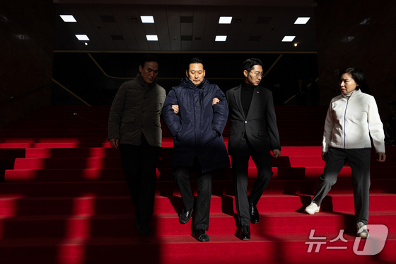 더불어민주당의 통일교 및 공천뇌물 특검 수용을 촉구하며 6일째 단식을 이어가고 있는 장동혁 국민의힘 대표가 20일 서울 여의도 국회 외부로 나서고 있다. 2026.1.20/뉴스1 © News1 이승배 기자
