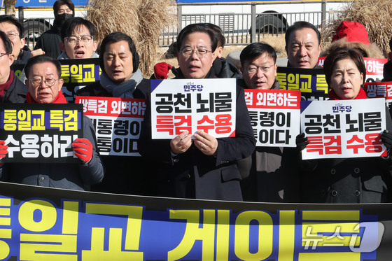 국민의힘 송언석 원내대표와 의원들이 20일 오전 서울 중로구 청와대 분수대 앞에서 열린 통일교 게이트 및 더불어민주당 공천뇌물 특검 촉구 규탄대회에서 피켓을 들고 구호를 외치고 있다. 2026.1.20/뉴스1 © News1 이광호 기자