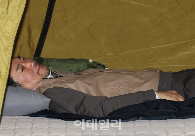 [이데일리 노진환 기자] 통일교 및 공천헌금 특검 수용을 촉구하며 7일째 단식을 이어가고 있는 장동혁 국민의힘 대표가 21일 서울 여의도 국회 로텐더홀에 마련된 농성장에서 의료용 산소 발생기를 착용하고 있다.