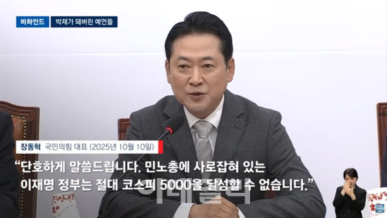 장동혁 국민의힘 대표는 지난해 10월 국회 행사에서 “이재명 정부는 입으로 코스피 5000을 외치고 있지만 단호하게 말한다”며 “민주노총에 사로잡힌 정부로는 절대 달성할 수 없다”고 단언했다.