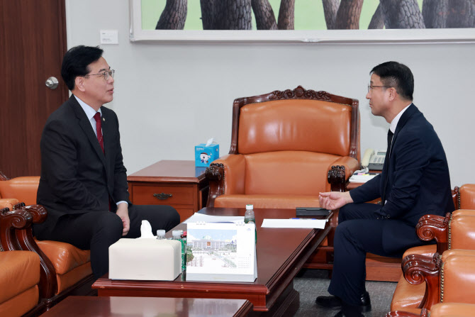 더불어민주당 한병도 원내대표(오른쪽)와 국민의힘 송언석 원내대표가 28일 국회 운영위원장실에서 회동하고 있다. (사진 = 연합뉴스)