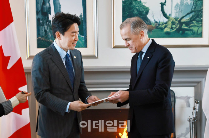 전략경제협력특사 자격으로 캐나다를 방문한 강훈식 청와대 대통령비서실장이 마크 카니 캐나다 총리에게 이재명 대통령의 친서를 전달하고 있다.(사진=강훈식 비서실장 SNS 갈무리)