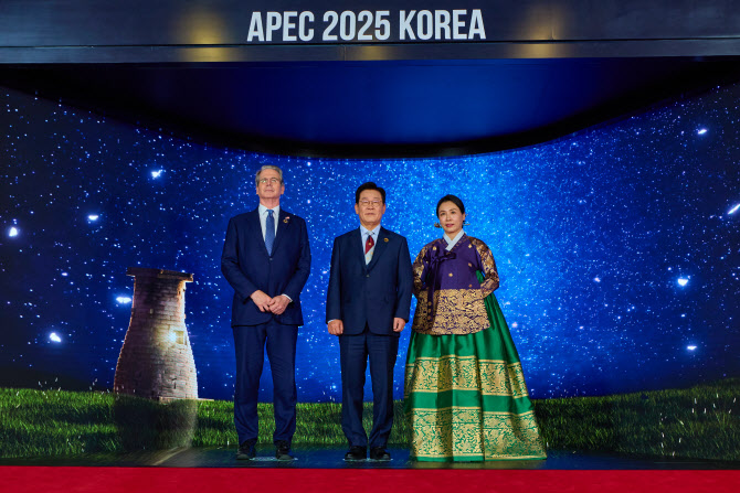 이재명 대통령과 김혜경 여사가 지난해 11월 경북 경주시 라한셀렉트호텔에서 열린 2025 아시아태평양경제협력체(APEC) 정상회의 만찬에서 스콧 베선트 미국 재무장관과 기념촬영을 하고 있다. (사진 = 대통령실)