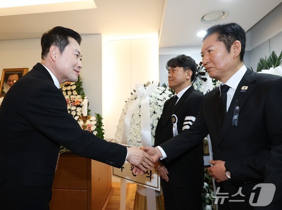 장동혁 국민의힘 대표가 30일 서울 종로구 서울대학교병원 장례식장에 마련된 고 이해찬 전 국무총리의 빈소에서 조문을 한 뒤 정청래 더불어민주당 대표와 악수하고 있다. 2026.1.30/뉴스1 © News1 사진공동취재단
