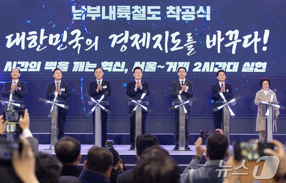 이재명 대통령이 6일 경남 거제시 견내량 인근에서 열린 남부내륙철도 착공식에서 착공기념 세레머니를 하고 있다. 왼쪽부터 이성해 국가철도공단 이사장, 박완수 경남도지사, 김윤덕 국토교통부 장관, 이재명 대통령, 김경수 지방시대위원장, 이철우 경북도지사, 김정자 거제시민. 2026.2.6 / © 뉴스1 이재명 기자