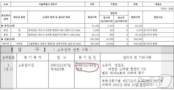 김 의원은 25일 자신의 SNS에 정 구청장(1968년 8월생)이 태어난 지 4개월 만에 논 38평, 2살 때 밭 599평을 증여받았다며 관련 토지등기부 대장을 소개했다.