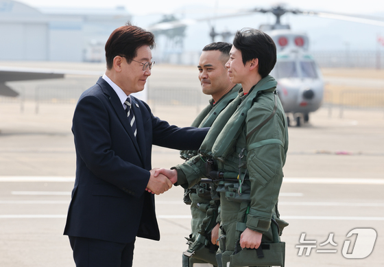 이재명 대통령이 25일 경남 사천 한국항공우주산업에서 열린 KF-21 양산 1호기 출고식에서 조종사를 격려하고 있다. 2026.3.25 © 뉴스1 이재명 기자
