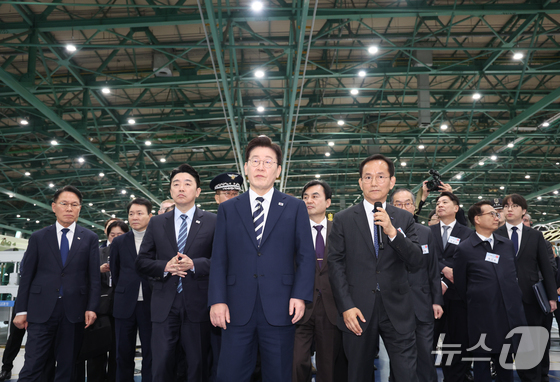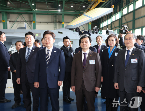 이재명 대통령이 25일 경남 사천 한국항공우주산업(KAI)에서 김종출 KAI 대표이사의 안내를 받으며 KF-21 생산현장을 살펴보고 있다. 2026.3.25 © 뉴스1 이재명 기자