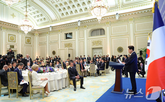 이 대통령은 환영사에서 "프랑스는 대한민국의 오래된 친구이자 동료"라며 "6·25 전쟁과 산업화 과정에서 프랑스는 중요한 조력자였다"고 평가했다. 이어 "1980년대 프랑스 기술을 토대로 원전이 건설됐고, 이를 토대로 빠른 성장을 견인할 수 있었다"고 했다.