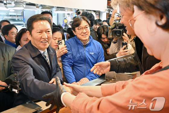 정청래 더불어민주당 대표가 6일 경기도 수원시 팔달구 못골시장을 경기도지사 예비후보들과 함께 방문해 상인들과 인사를 나누고 있다. (공동취재) 2026.4.6 © 뉴스1 김영운 기자