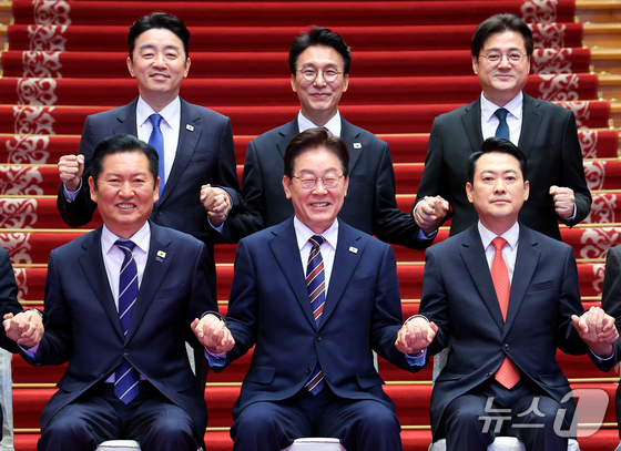 이재명 대통령과 정청래 더불어민주당 대표, 장동혁 국민의힘 대표가 7일 청와대에서 열린 여야정 민생경제협의체 회담 및 오찬에서 기념촬영을 하고 있다. (청와대통신사진기자단) 2026.4.7 © 뉴스1 이재명 기자