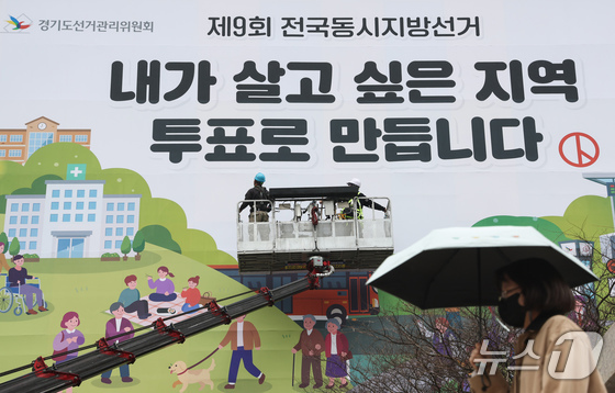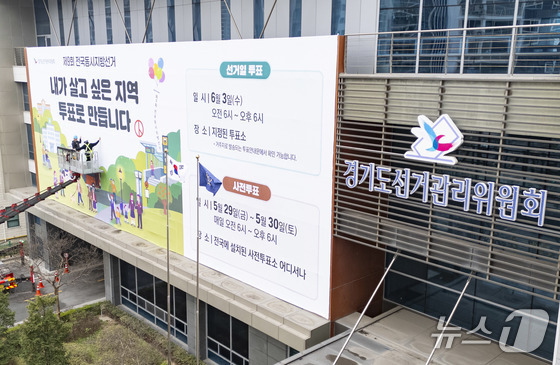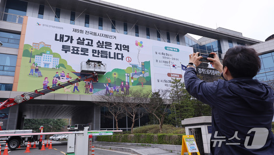 제9회 전국동시지방선거를 50여일 앞둔 9일 오전 경기 수원시 영통구 경기도선거관리위원회 청사 외벽에 투표참여 홍보를 위한 대형 현수막이 게시되고 있다. 2026.4.9 © 뉴스1 임지훈 인턴기자