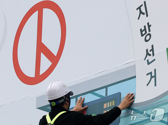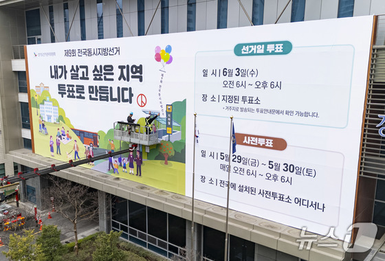 제9회 전국동시지방선거를 앞둔 9일 경기도 수원시 영통구에 위치한 경기도선거관리위원회 청사 외벽에 투표 참여를 독려하는 대형 현수막이 설치됐다. 이날 관계자들은 청사 전면에 대형 현수막을 내걸며 본격적인 선거 홍보 활동에 나섰다.
