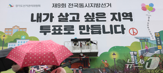 제9회 전국동시지방선거를 앞둔 9일 경기도 수원시 영통구 경기도선거관리위원회 청사 외벽에 관계자들이 투표참여를 독려하는 대형 현수막을 설치하고 있다.(공동취재) 2026.4.9 © 뉴스1 박지혜 기자