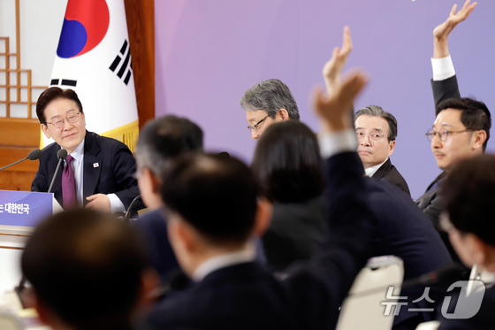이재명 대통령이 9일 청와대에서 열린 국민경제자문회의 제1차 전체 회의에서 발언권을 요청하는 참석자들을 바라보고 있다. (청와대통신사진기자단) © 뉴스1 허경 기자