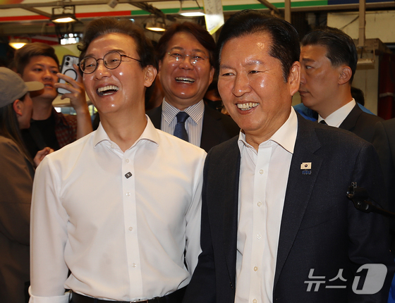 정청래 더불어민주당 대표와 전재수 부산시장 후보가 15일 부산 부산진구 부전시장을 찾아 상인과 인사하고 있다. 2026.4.15 © 뉴스1 윤일지 기자