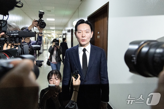 14일 서울 여의도 국회에서 열린 제434회국회(임시회) 윤석열 정권 정치검찰 조작기소 의혹 사건 진상규명 국정조사특별위원회 쌍방울 대북송금 조작기소 의혹 사건 청문회에서 증인으로 출석한 박상용 검사가 증인 선서 거부 및 소명서 미제출로 퇴장 당해 입장을 밝히고 있다 2026.4.14 © 뉴스1 이승배 기자