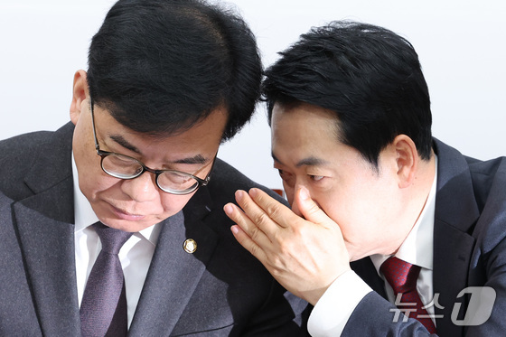 장동혁 국민의힘 대표와 송언석 원내대표가 20일 서울 여의도 국회에서 열린 최고위원회의에서 대화하고 있다. 2026.4.20 © 뉴스1 신웅수 기자