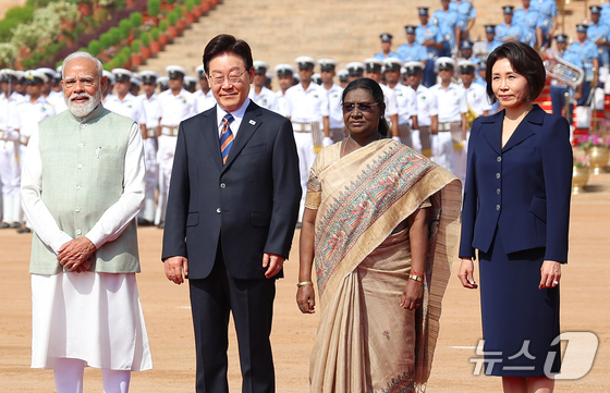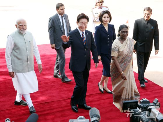 이재명 대통령과 김혜경 여사가 20일 뉴델리 대통령궁 광장에서 열린 공식환영식에서 드라우파디 무르무 인도 대통령, 나렌드라 모디 인도 총리(왼쪽)와 이동하고 있다. 2026.4.20 © 뉴스1 이재명 기자